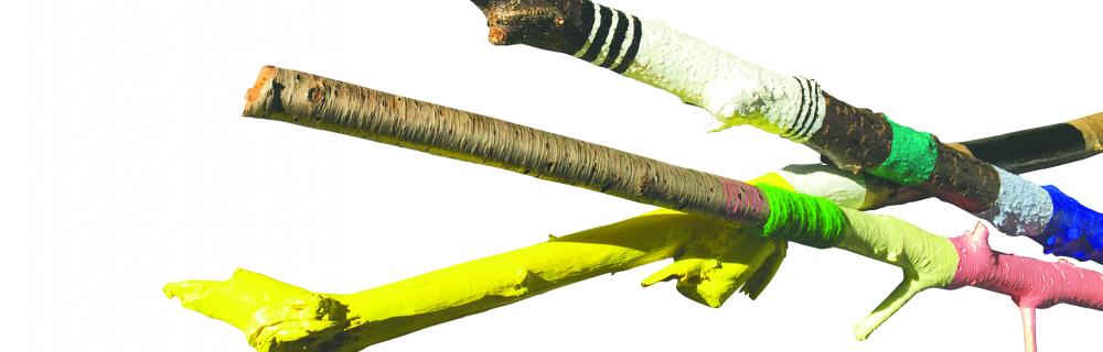 Kom og vær med - med simple teknikker lærer vi at lave flotte kunstværker med grene og stammer. Vi skal vikle med farvestrålende garn og male flotte mønstre på grene og stammer.